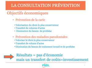 Les objectifs économiques de la prévention portent sur la valorisation du choix le plus conservateur. La diminution des besoins de prothèse et de traitement invasif au profit des actes conservateurs et de la prévention se fait par un transfert de volume d’actes, il n’y aura pas d’économie globale à attendre. Ce transfert de coûts se traduit par un investissement pour une meilleure santé. La convergence des objectifs de santé et d’économie se traduit par : INVESTIR DANS LA QUALITÉ DE VIE DES PATIENTS.