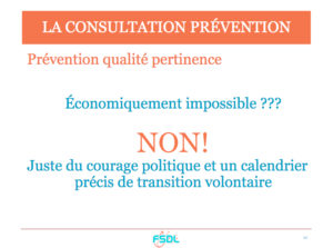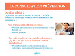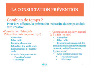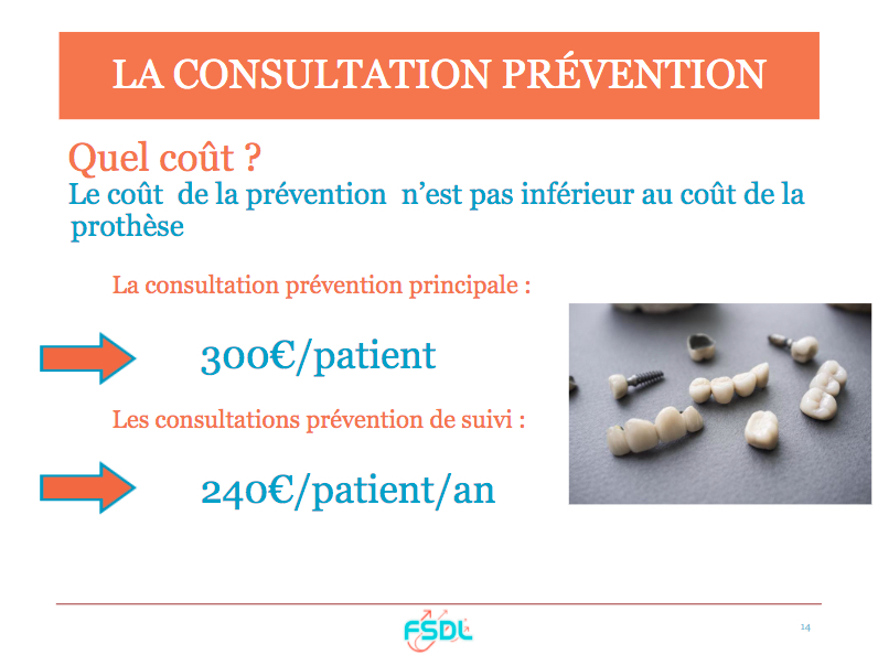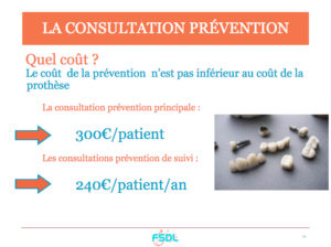 Le coût de la prévention n’est pas inférieur au coût de la prothèse. Le projet que nous soutenons s’articule autour de 2 types de consultations spécifiques de prévention : la consultation de prévention principale et les consultations de prévention de suivi. La consultation de prévention principale, à fréquence quinquennale, comporte, l’anamnèse, un bilan radio, une enquête alimentaire, l’éducation à la santé orale, un enseignement à l’hygiène orale et des actes techniques associés (Fluoration/sealent/Détartrage). Sa valorisation devra être de 300€/patient pour 1h30 de consultation.