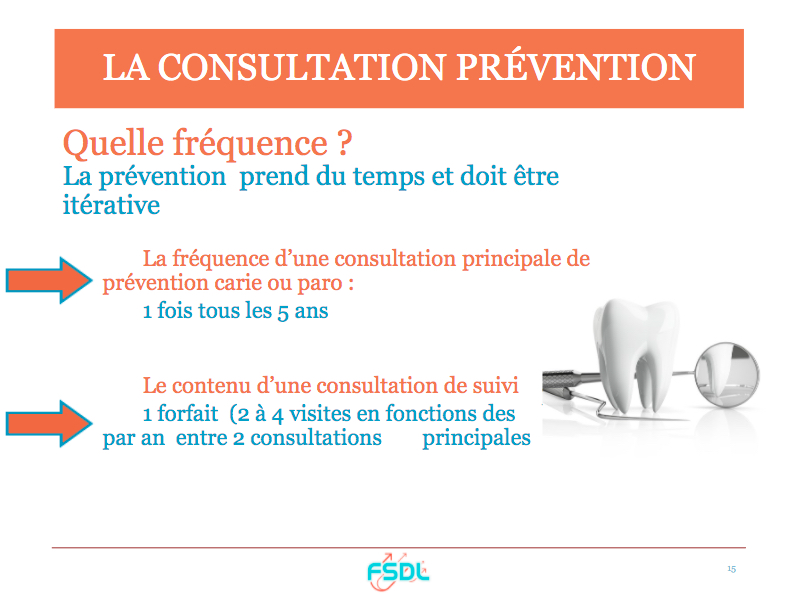 La fréquence des consultations de suivi sera établie lors de la consultation principale (2 à 4 fois/an selon les besoins du patient). Ces consultations prévention de suivi comporteront les actes techniques associés (Fluoration/sealent/Détartrage) mais elles permettront surtout l’évaluation des acquis et des modifications du comportement de santé orale du patient. La rémunération forfaitaire, devra être de 240€/patient/an.