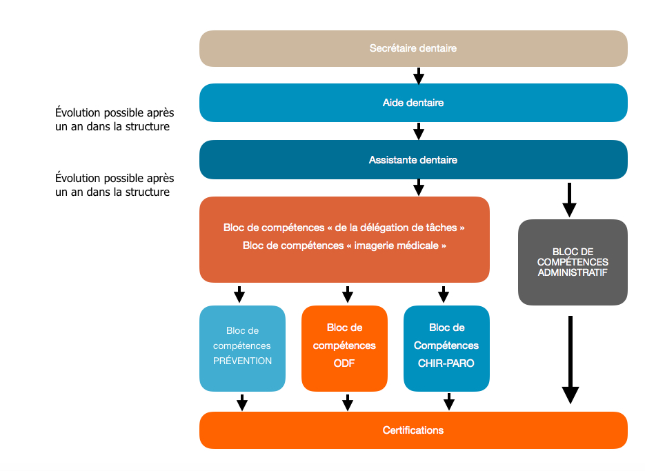 La création de ce portefeuille de compétences additionnelles deviendrait alors un véritable outil d’évolution dans la carrière de nos collaborateurs. Cette organisation en module de formation certifiante associée à une véritable possibilité d’individualiser les parcours de formation répond à la demande des assistants dentaires et aux besoins de nos structures.