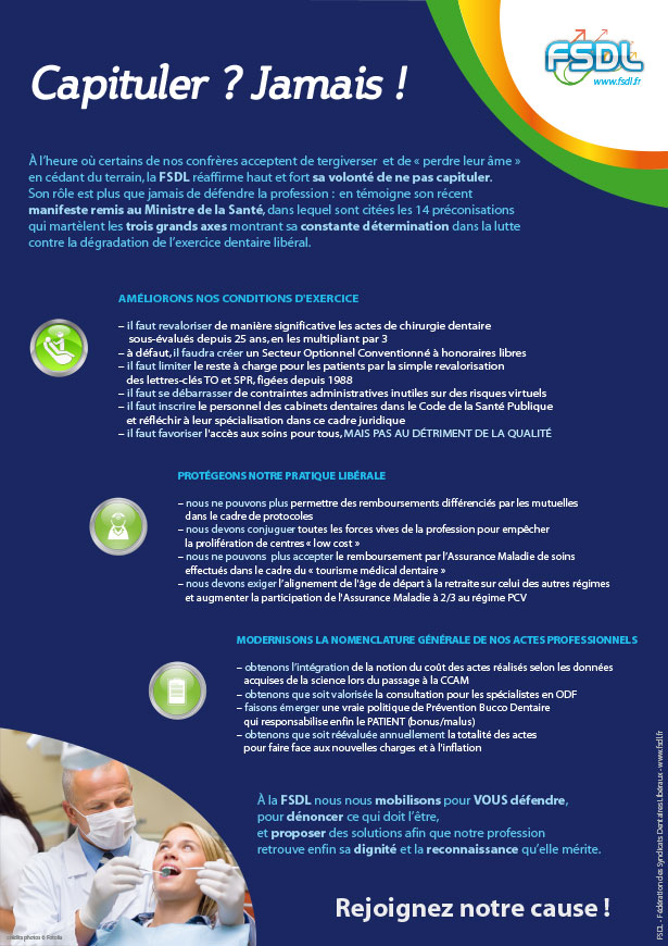 À l’heure où certains de nos confrères acceptent de tergiverser et de « perdre leur âme » en cédant du terrain, la FSDL réaffirme haut et fort sa volonté de ne pas capituler. Son rôle est plus que jamais de défendre la profession : en témoigne son récent manifeste remis au Ministre de la Santé, dans lequel sont citées les 14 préconisations qui martèlent les trois grands axes montrant sa constante détermination dans la lutte contre la dégradation de l’exercice dentaire.