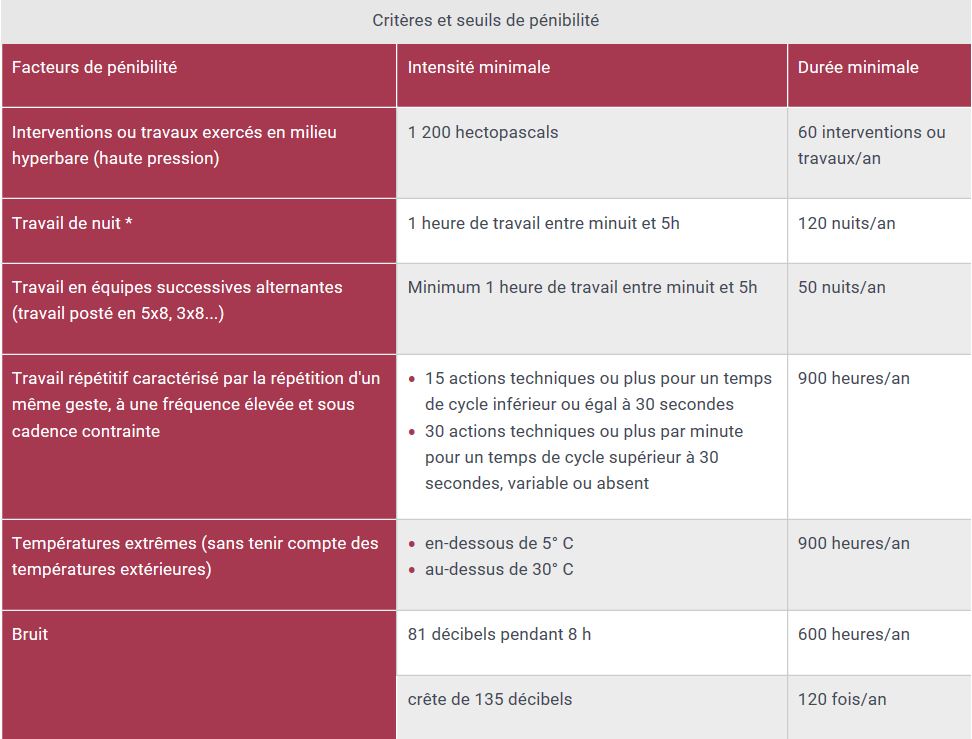 A ces facteurs de pénibilité sont associés des seuils, définis par le Code du Travail et à respecter