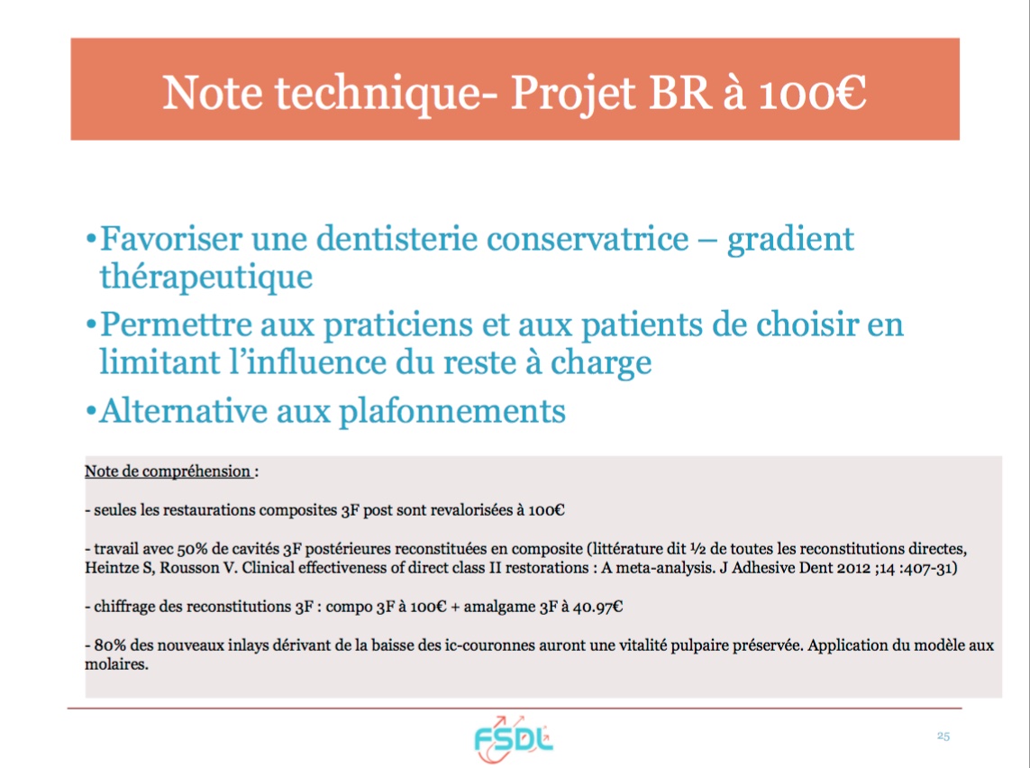 - Côté syndicats dentaires, nous, FSDL, n’avons eu de cesse de montrer qu’une autre voie était possible s’articulant autour d’une prévention enfin rémunérée et d’une valorisation cohérente des soins conservateurs (voir « la consultation de prévention »,et « les propositions de la FSDL« ). Nos propositions sont claires et fidèles à nos convictions : elles s’articulent autour de trois idées-forces. La consultation de prévention regroupant tous les actes préventifs, associée à la consultation de suivi permettrait enfin d’envisager la globalité du patient. Nous souhaitons également faire de la codification des actes un véritable outil de santé publique permettant de favoriser les techniques préservant l’organe dentaire (voir “tout à 100€”).