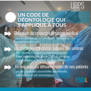 Le code de déontologie doit s’appliquer pour le praticien-salarié d’un OCAM de la même manière que pour un chirurgien-dentiste libéral, sans exclusion ni dérogation.Nous espérons être rejoints par l’ensemble des syndicats sur ce sujet qui devrait faire consensus !